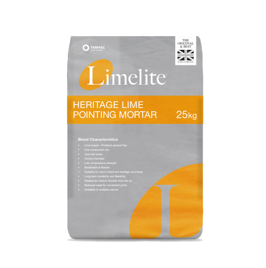 Limelite Lime Pointing Mortar is a cement free blend of natural hydraulic lime and selected aggregates with additives designed to improve the workability of the mortar when repointing. Available in 6 colours with a strength class of M5.0.